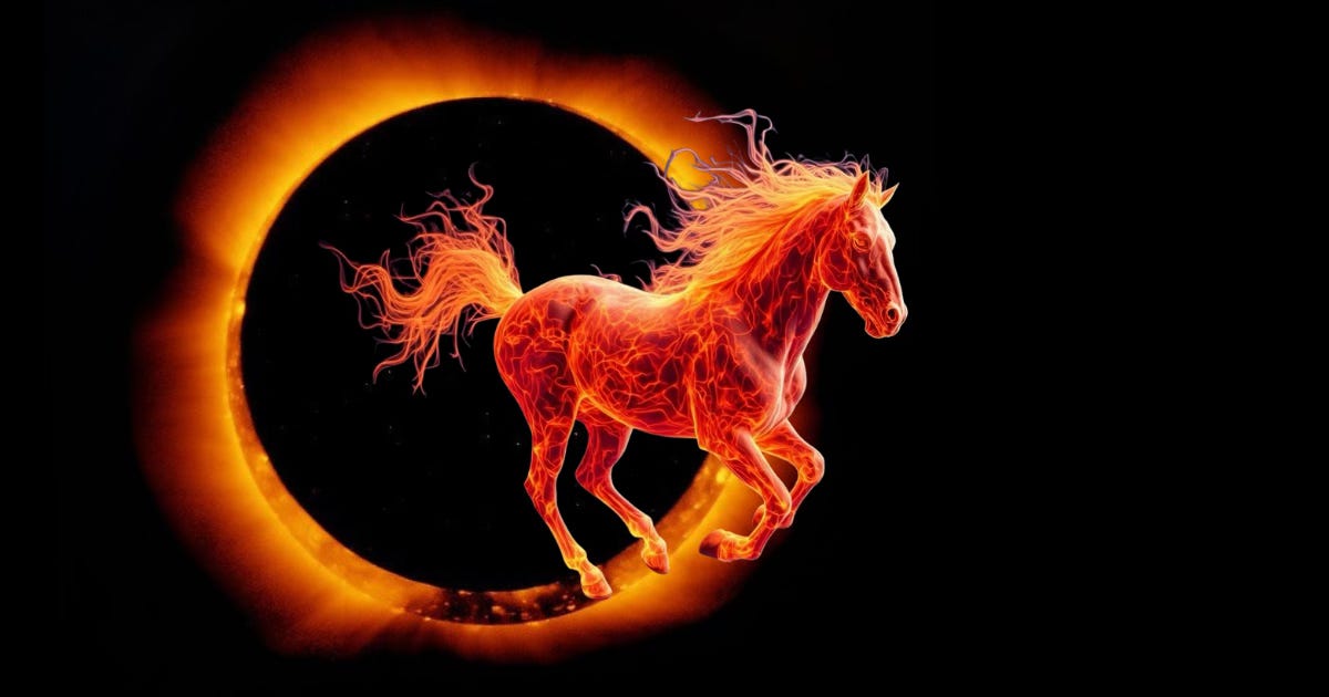 As a partial eclipse, it will produce a ‘ring of fire’—a fitting portal for the arrival of the Fire Horse energy of the Chinese New Year: unbridled, instinctual, herd-aware, and intolerant of confinement.